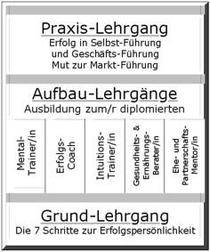 Für die fünf Aufbau-Lehrgänge ist der GRUNDLEHRGANG obligatorisch (Pflicht), der PRAXIS-Lehrgang fakultativ (Kür). Er ist zu empfehlen, wenn Sie sich nach dem Studium mit einer eigenen Beratungspraxis selbstständig machen wollen.
